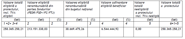 Valoarea totală eligibilă a proiectului este de 258.365.258,21 lei, după cum urmează: