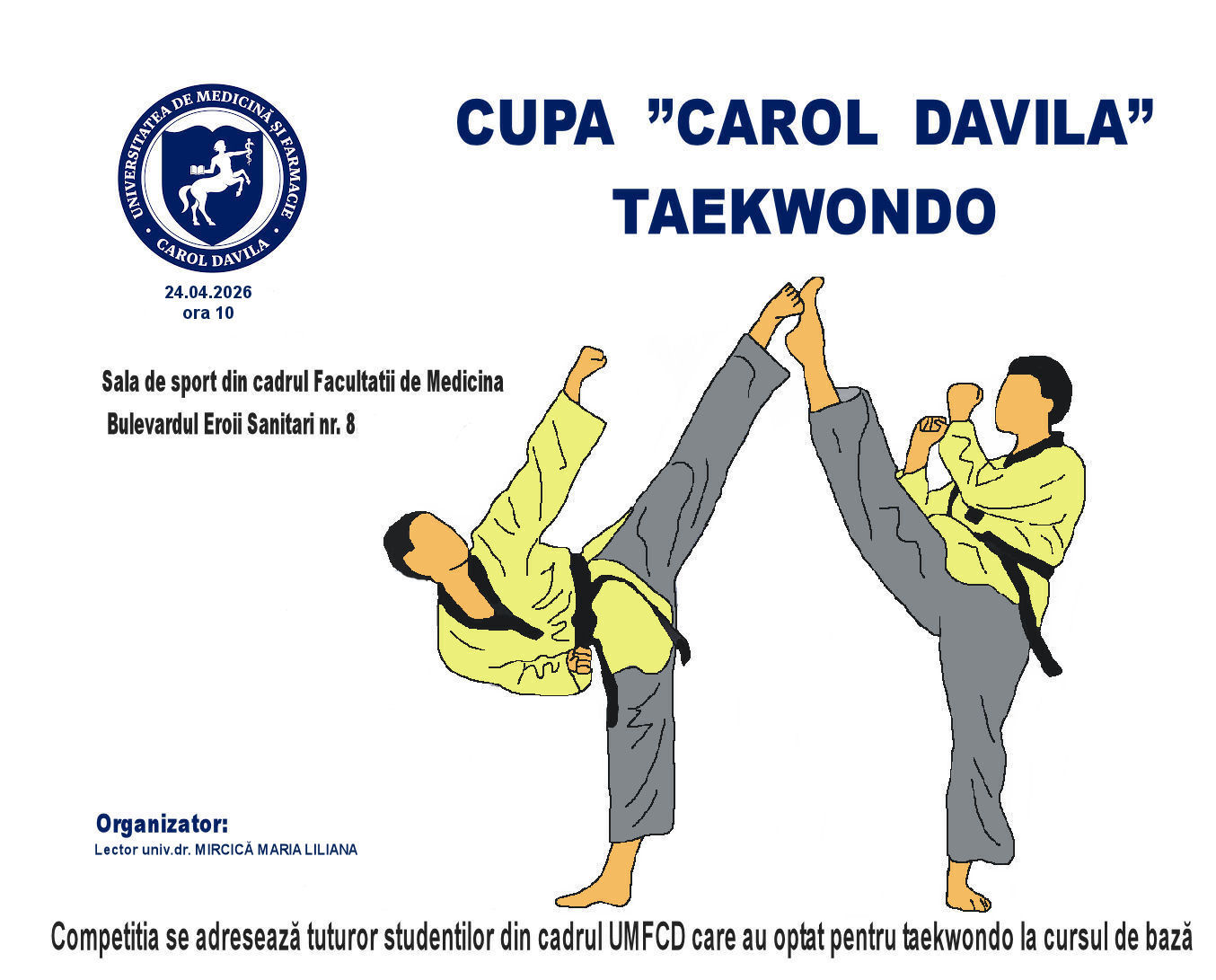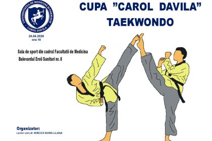 Disciplina de Educație Fizică și Sport 🥋 din cadrul Universității de Medicină și Farmacie “Carol Davila” din București🏫, prin Direcția Antreprenoriat Studențesc, Alumni, Activități Studențești, Proiecte și Programe, vă invită vineri, 📅 24 aprilie 2026, 🕙 ora 10:00, la 📍sala de sport a UMFCD, unde organizează 🏆 competiția de Taekwondo „Cupa Carol Davila”, un eveniment dedicat studenților pasionați de sport și performanță🌟